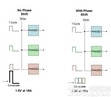 同步多個DC/DC轉換器通道比較容易和簡單,但相移編程卻可能是個挑戰。圖2是同相和異相配置的DC/DC轉換器的對比。兩種設計均使用三相方法來提供24A輸出電流。若想增大輸出電流,可增加相數。在兩種方案中,每個轉換器均已優化為8A輸出電流。左側配置為同相工作,而右側的設計使每個相位偏移約120°。左側的3個轉換器具有24A(3×8A)峰值輸入紋波或12A RMS (50%占空比) 。右側的3 個異相工作轉換器的工作電流為8A或4.3A RMS(50%占空比)。