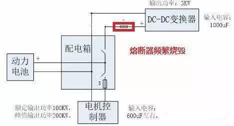 電機控制器的電容出了問題,不足負載需求,需要快速充電時DC/DC內的電容放電了(電流往回走),所以導致這個熔斷器損壞。