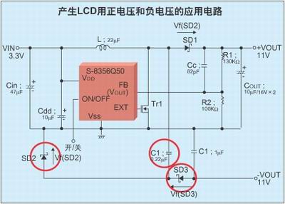 圖2是產生LCD用正電壓和負電壓的應用電路,它用一個升壓DC/DC變換器來產生正負電壓。電路中使用了VDD/VOUT分離型器件S-8356Q50,在Vout端子接口,通過使用電阻對輸出電壓進行分壓,這樣可以調整輸出電壓。通過R1和R2正電壓可以達到很高,負電壓可以通過C1、SD3、SD2使正電壓反轉為負電壓。