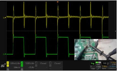圖4 CH1使用夾子測(cè)量電源輸出,CH2使用夾子測(cè)量電感,各自接地