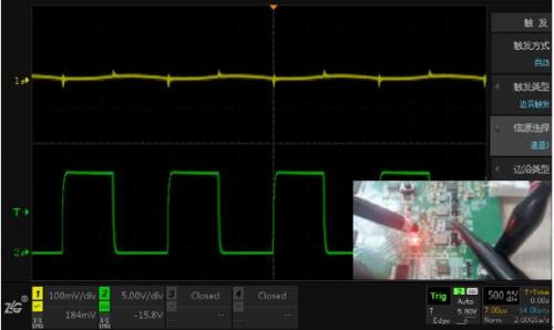 測(cè)試方法:通道1測(cè)量小信號(hào)(100mv/div),通道2測(cè)量大信號(hào)(5V/div),觀察信號(hào)互相影響的情況。