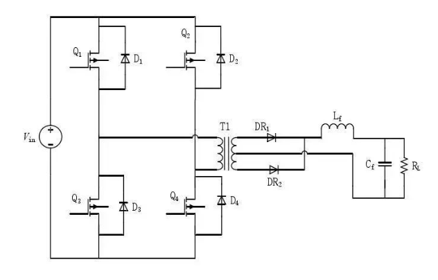 上圖中,Vin為輸入電壓,需要通過DCDC回路,在輸出端得到一個需要的輸出電壓。原邊開關電路,將輸入電流調制成矩形波,這個過程主要依靠控制器調制特定占空比的PWM波,用以驅動四個開關管按照既定的順序和時間開閉,從而實現電流逆變過程。原邊輸入電壓可以通過占空比調節,占空比增加輸出電壓也增加,占空比減小輸出電壓減小。頻率則可以通過調節開關頻率調節。T1位變壓器,變比你n。變壓器既可以實現電氣隔離,又可以起到電壓調節的作用。一個固定的原邊線圈匝數,副邊改變匝數,即可得到不同的電壓等級。變壓器的輸入,是經過左側全橋電路逆變得到的脈沖矩形波,傳遞到變壓器的副邊,得到的是另一個電壓幅值的交流正弦波。經過DR1和DR2整流以后,再經由Cf和Rl濾波處理,得到直流電,提供給輸出端。